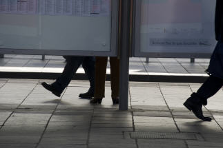 Darunter sind Menschen, die auf einem Bahnhof an einer Anzeigetafel abgelichtet wurden.